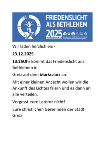 In diesem Jahr wird das ORF-Friedenslicht aus Bethlehem in Ostthüringen am 23.12. verteilt. In Greiz wird es Am Markt 12 um 13:25 Uhr erwartet. Wir begrüßen und teilen das Licht mit einer kleinen Andacht.